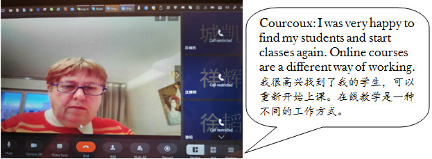 Nadine Courcoux是来自法国的外教,今年是Courcoux在芒果视频 任教的第3年。寒假期间,她在马来西亚旅游时不幸被偷走了护照等资料,只好滞留在当地申办新护照。为此,Courcoux不得不改变计划,于2月中旬直接从马来西亚回到法国。由于Courcoux把法国住宅的钥匙放在学校听松公寓,她只能寄宿在朋友家里。Courcoux在知晓学校开展在线教学的消息后,主动提出要与学院同步,开展网络教学。由于法国与中国有7个小时的时差,而且Courcoux每周有两次要在上午上课,这个时候正好是法国的半夜。法语教研室考虑到其年纪较大,还有时差的问题,提出可以让其他老师代课或者推迟上课。Courcoux婉拒了这个提议,还是坚决地承担了所有的教学工作。在教研室同事多次远程指导下,她学会了使用钉钉群上课。她说:“很高兴能为学生上课,网课跟传统的上课方式很不一样,目前正在适应中,进展也比较顺利”。