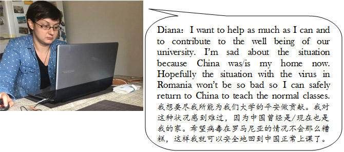 来自罗马尼亚的外教Diana Brade是一位年轻的女博士,热情开朗,与学生关系非常融洽。由于疫情影响,她在寒假期间赴缅甸度假后回杭州的航班被取消,只好回到了自己的国家。由于Diana临时的住所没有电脑、网络等设备,但是她又很想同步进行在线教学,于是她设法向朋友借了电脑,又跟邻居协商借用WIFI,终于在开学第二周开启了网络教学。在上课前,她通过钉钉群向学生提出相关问题并要求学生用录音进行回答。在课堂上针对学生的回答,进行详细的点评,取得了很好的互动效果。