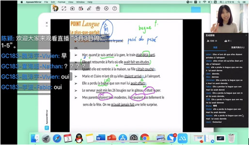 上图中白色的框内是我的ipad屏幕,彩色的标注是我在直播过程中边讲课边进行的。在这个知识点讲述中只需要保持在这一个窗口,操作非常便利。此外,书写功能和ppt播放本身的动画功能并不冲突,可以更好地引导学生思考与互动。图片中右侧为同学们在评论区积极回答问题。
