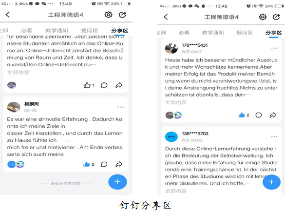 通过钉钉分享区,学生发表了对在线课程的评价。学生认为,通过该课程,听说读写语言能力得到了全方面的训练。比较突出的问题是:电子书和各种电子资料的使用不如纸质的方便。