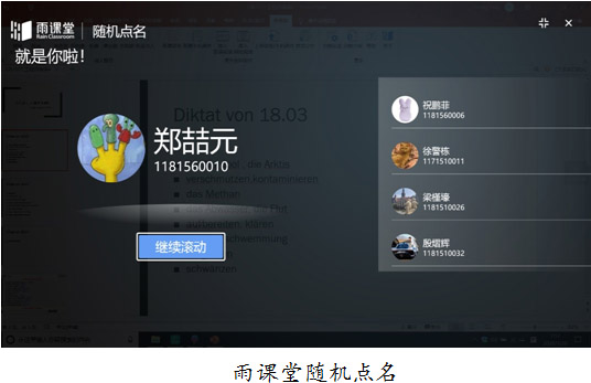 课中,会运用雨课堂的点到功能进行点名,学生可以发弹幕告知老师已到课堂。还会进行围绕预习知识进行的小练习,检查学生的预习情况。有时,课中还会进行听写,学生写好后在规定时间内投稿。