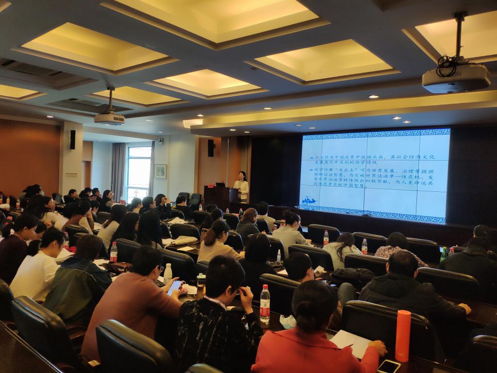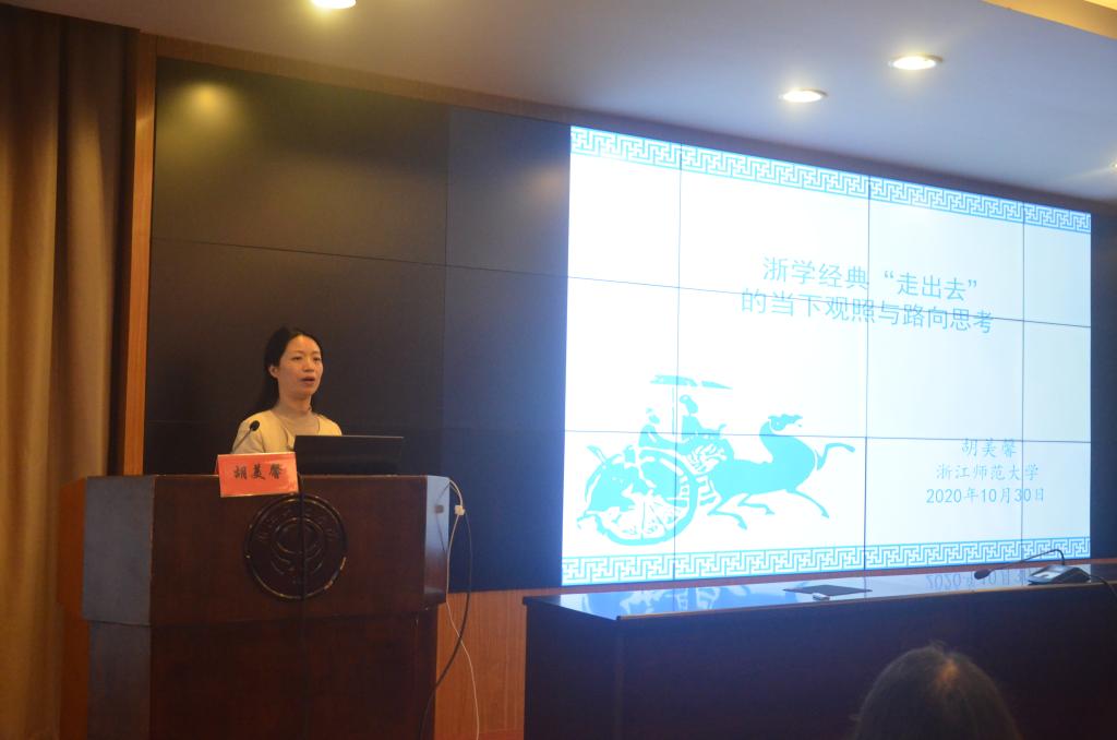 首先,胡美馨教授作了题为《浙学经典“走出去”的当下观照与路向思考》的精彩报告。她指出浙学虽以地域为名,但是众多浙江学者已将很多问题置于世界文明比较中进行思考,因此面对现代性话语体系中存在的话语单一性危机和全球化时代不对等的文化互动等现状,以浙学经典为代表的中国传统经典应该采取“走出去”的原则,打破当今话语体系中的“话语霸权”,形成独特的中国传统话语。胡美馨还提出了浙学经典“走出去”的路向思考。借助浙学研究的已有成果,采用文本辨读的经注策略,同时兼蓄差异、协同创新,浙学经典“走出去”不仅可为突破世界话语单一性危机、发展世界话语多样性做出积极贡献,同时也可为世界发展、治理等提供独特话语智慧,为人类命运共同体愿景贡献中国智慧。