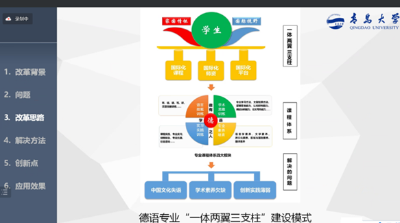 10月21日下午,“中德芸”讲坛第16期暨教学发展论坛第117期如期举行,北京外国语大学德语语言文学专业博士,德国埃森文化研究所、杜伊斯堡—埃森大学访问学者,原解放军外国语学院德语教授、博导,现任青岛大学外语学院德语系主任、国家级一流本科专业德语学科负责人,省级智库中德文化交流研究中心、山东省与德国交流合作研究中心主任,教育部虚拟教研室建设试点“德语翻译课程虚拟教研室”负责人綦甲福老师以“新文科背景下外语专业的守正与创新——以青岛大学德语一流专业建设为例”为题作专题报告。我校师生30余人参加了在线会议。