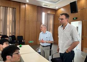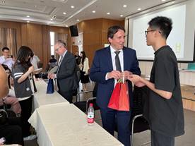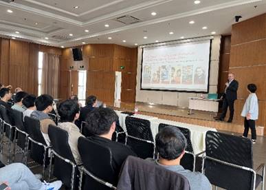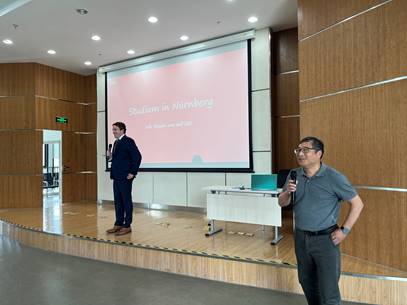 汉诺威应用科学大学机械学院的Greife教授展现了他流利的汉语水平。他和Köhler教授共同介绍了机械学院的专业方向、课程安排、机器人和能源技术实验室等工作,方程式赛车的团队比赛以及如何在汉科大进行学习和生活上的过渡。