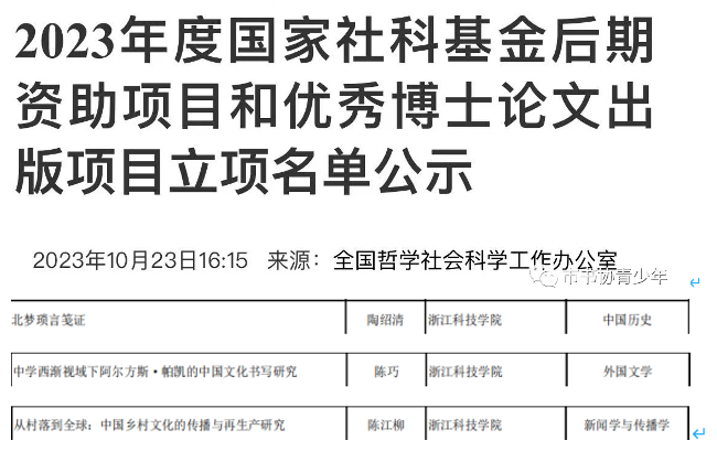 近日,全国哲学社会科学工作办公室公布2023年度国家社科基金后期资助项目名单,由浙江科技学院芒果视频 教师陈巧博士主持的研究项目“中学西渐视域下阿尔方斯·帕凯的中国文化书写研究”成功获得后期资助课题立项。