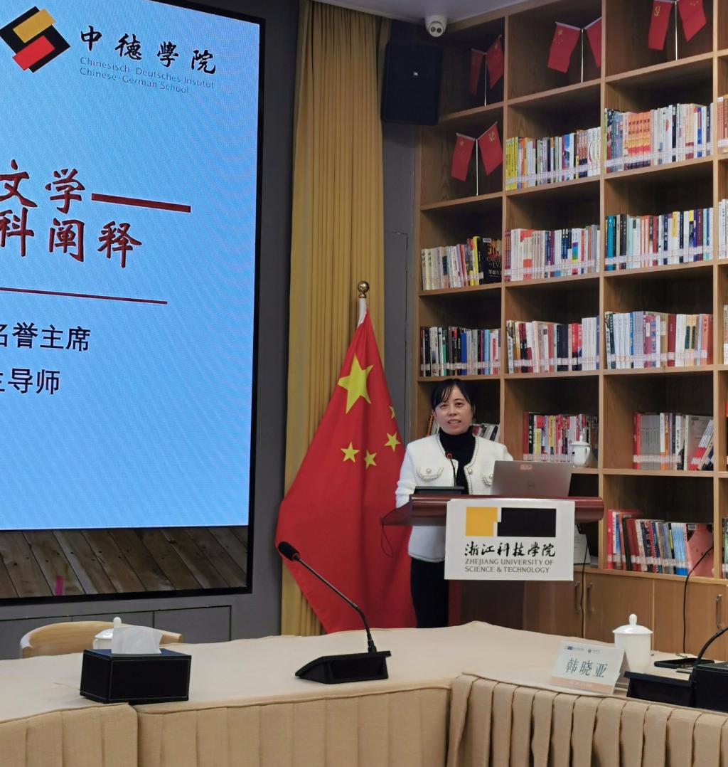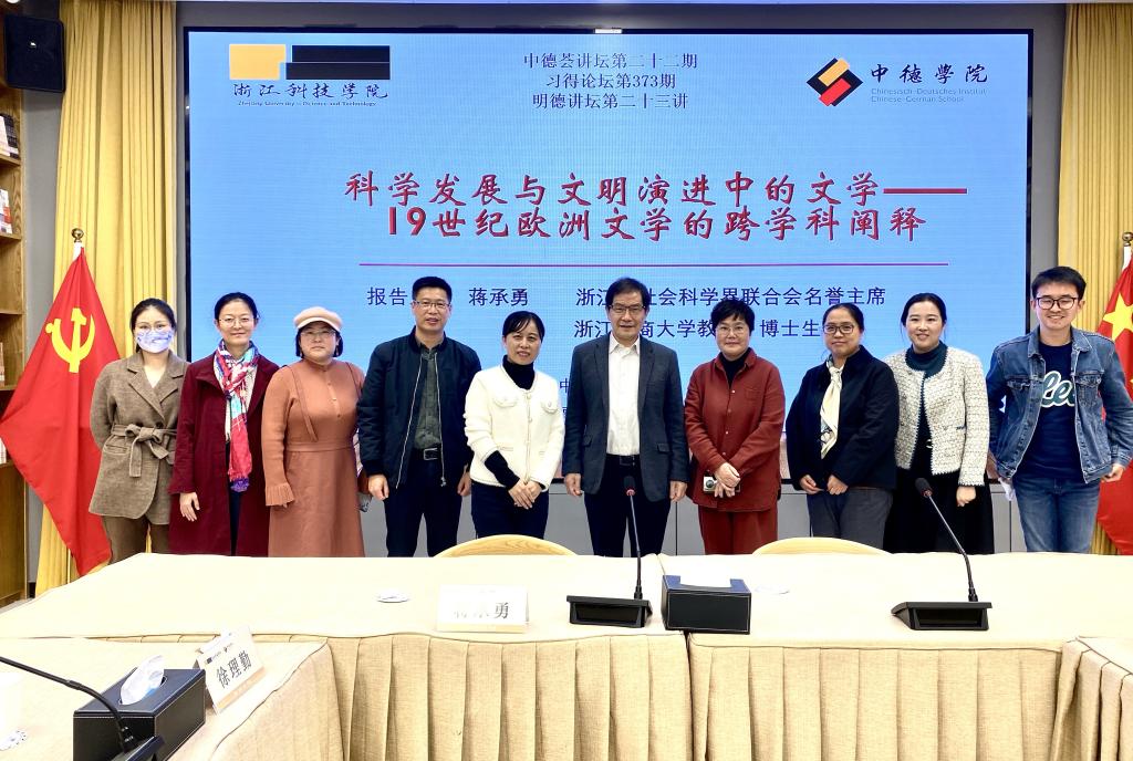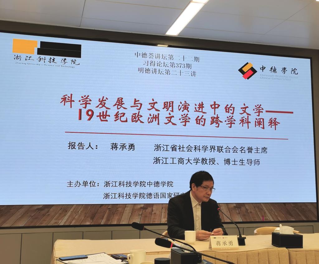 2023年11月24日,由浙江科技学院芒果视频 和德语国家研究中心主办的 “中德荟”讲坛第二十二期学术报告在学校师生服务中心会议室举行。本次报告题为“科学发展与文明演进中的文学——19世纪欧洲文学的跨学科阐释”,由浙江工商大学文科资深教授、浙江省“特级专家”和“功勋教师”蒋承勇主讲,芒果视频 院长韩晓亚主持。德语国家研究中心主任徐理勤、科研处处长马伟锋以及芒果视频 、人文学院和德语国家研究中心的老师们现场聆听了本场学术报告,反响热烈。