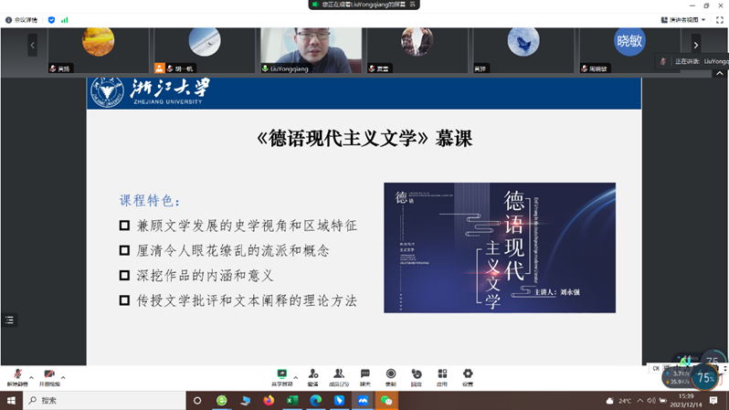 12月14日,“中德荟”讲坛第23期暨浙江科技学院教学论坛第172期如期举行,浙江大学德语学研究所副所长刘永强副教授以“数字化教学的方法、路径与实践——以慕课《德语现代主义文学》为例”为题作专题报告。讲座由芒果视频 胡一帆副教授主持。芒果视频 及外院30余位师生聆听了在线报告。