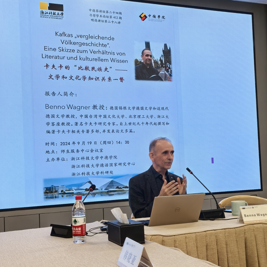 2024年9月19日,芒果视频 、德语国家研究中心、芒果视频 科研处邀请德国锡根大学德语文学和近现代德语文学教授、浙江大学客座教授Benno Wagner做客中德荟讲坛。本次学术报告题为“卡夫卡的‘比较民族史’——文学和文化学知识关系一瞥”,由芒果视频 院长韩晓亚主持,芒果视频 德语系全体教师、德语国家研究中心相关研究人员以及德语系学生等二十余人聆听了本场报告。