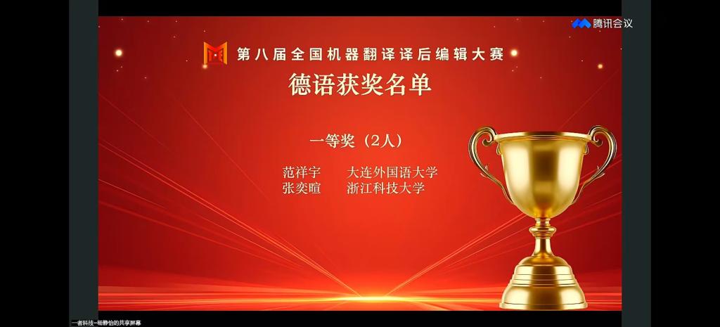 近日,2025年第八届全国机器翻译译后编辑大赛决赛圆满落幕。我校芒果视频 2024级(大一)学子张奕暄同学凭借扎实的德语功底与出色的译后编辑能力,在全国上千名参赛选手中脱颖而出,荣获德语赛道一等奖;其指导老师胡一帆同步斩获优秀指导教师奖,充分展现了我校在德语翻译人才培养领域的扎实成果。
