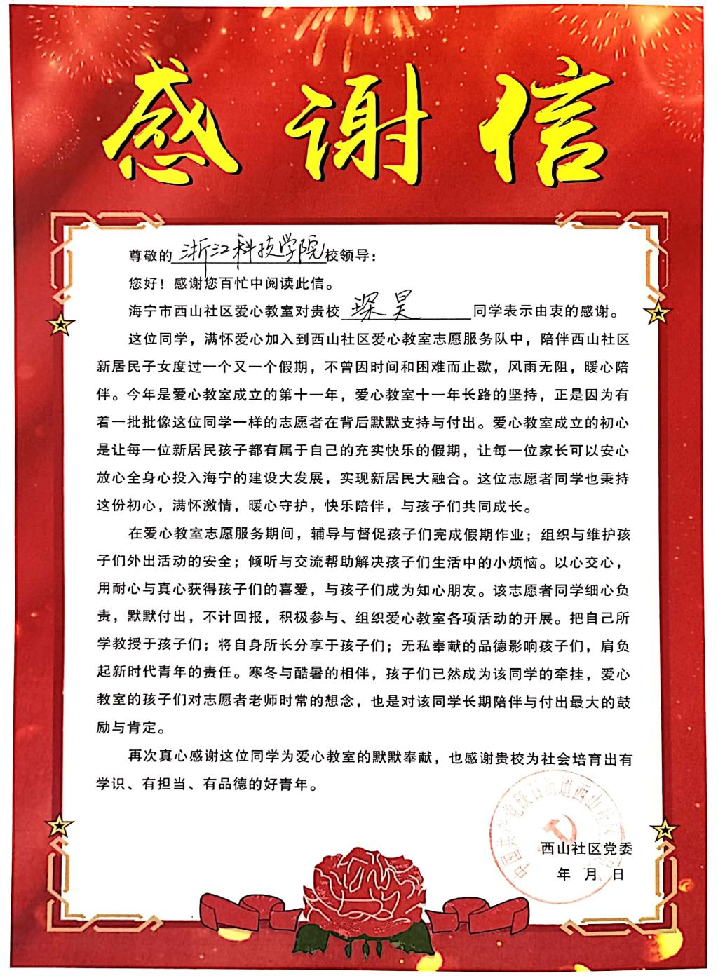 近日,海宁市西山社区爱心教室就芒果视频 琛昊同学的志愿工作寄来了感谢信,表示由衷的感谢。信中表示:琛昊同学怀揣着自己的一份爱心加入到西山社区爱心教室志愿服务队中,陪伴社区新居民子女度过假期、辅导并督促孩子们完成假期作业、组织和维护孩子们外出活动的安全并倾听解决孩子们的烦恼,同时将其所学传授给孩子们,将自身所长分享于孩子们。在此志愿服务期间,琛昊同学保持激情、细心负责、不求回报,既推动了爱心教室的持续...